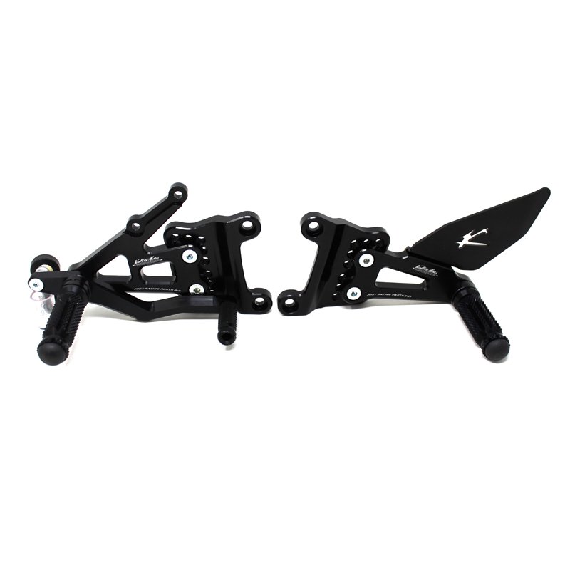 Adjustable Type 1.5 rearsets are developed for street/racing use, entirely made with CNC machinery in Ergal 7075 T5 alloy. Footpegs and frontpegs are made in aluminum alloy machined to obtain an optimal grip. Shift and brake levers are mounted on two ball bearings to avoid any friction. Adjustable plates allows from 6 to 9 different positions to find the best feeling on the bike. Rearsets are provided with black aluminum heel protections, the correct length shift rod, shift and brake ball joints, brake light pressure switch.